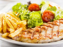 Pechuga de pollo a la plancha con patatas fritas y ensalada